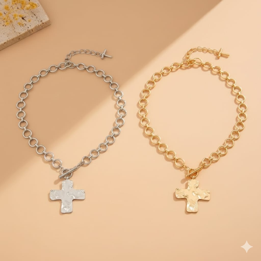 COLLAR DORADO O PLATEADO CON CRUZ MARTILLADA Y CIERRE FRONTAL CON PALANCA. ES UNA PIEZA LLAMATIVA, ELEGANTE Y CON UN TOQUE ARTESANAL. CON UN LLAMATIVO COLGANTE DE CRUZ MARTILLADA, ESTE COLLAR LUCE UN ASPECTO TEXTURIZADO Y ARTESANAL QUE LE APORTA PROFUNDIDAD Y SINGULARIDAD. EL CIERRE FRONTAL CON PALANCA NO SOLO FACILITA SU USO, SINO QUE REALZA EL DISEÑO CON UN TOQUE MODERNO Y PERMITE AJUSTAR EL LARGO.