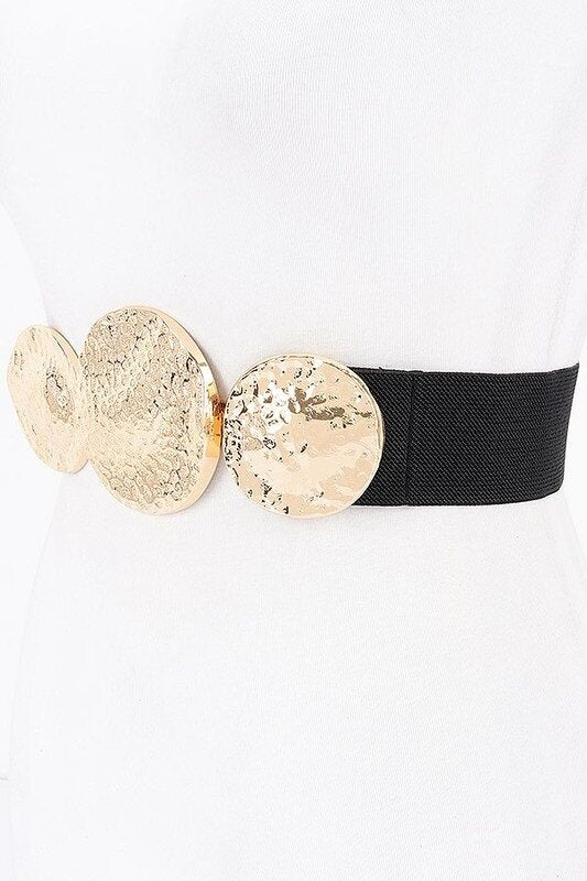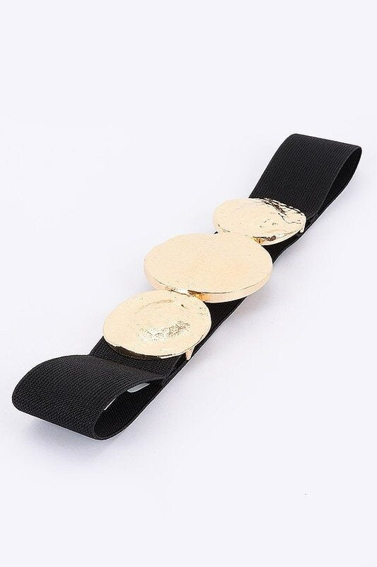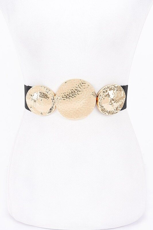 CINTURÓN ELÁSTICO NEGRO CON HEBILLA METÁLICA DE 3 ESFERAS DORADAS. ESTE IMPRESIONANTE CINTURÓN PRESENTA UN DISEÑO ÚNICO DE HEBILLA REDONDA METÁLICA, LO QUE LO CONVIERTE EN EL ACCESORIO PERFECTO PARA REALZAR CUALQUIER ATUENDO.