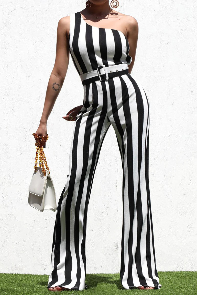 Black and white striped one-shoulder jumpsuit. Includes strap, comfortable fit, invisible side zipper.