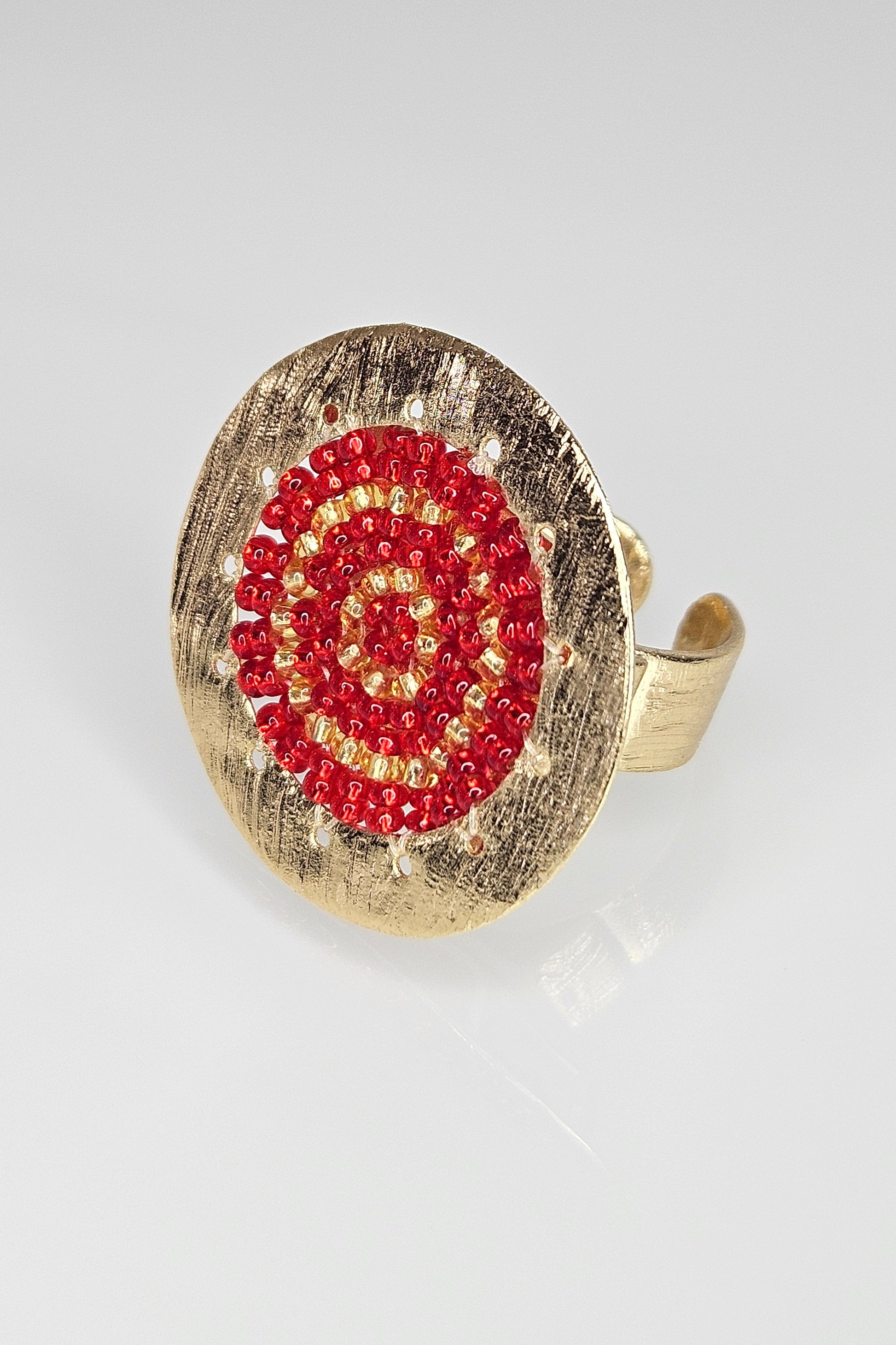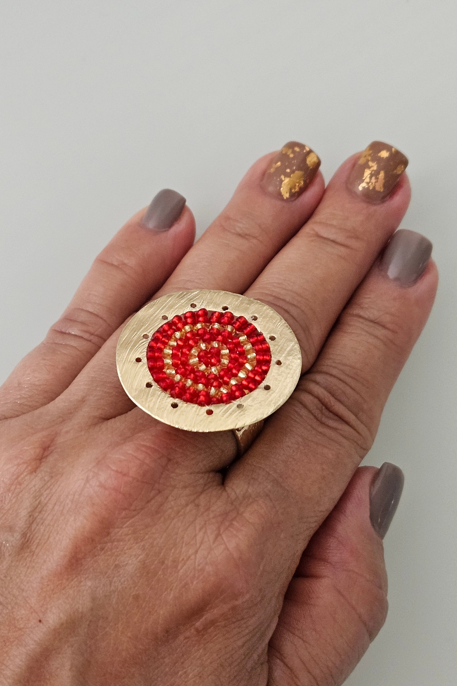 SORTIJA DORADA Y ROJO. ALUMINIO CON BAÑO DE ORO. ES AJUSTABLE Y BIEN LIVIANA. HECHO A MANO EN COLOMBIA.