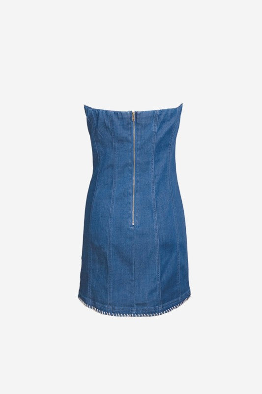 TRAJE CORTO MAHÓN STRAPLESS. CON PESPUNTES. TELA: 65 % TENCEL, 34 % POLIÉSTER, 1 % ELASTANO. LAVAR A MANO CON AGUA FRÍA. TAMAÑO: S-M-L.