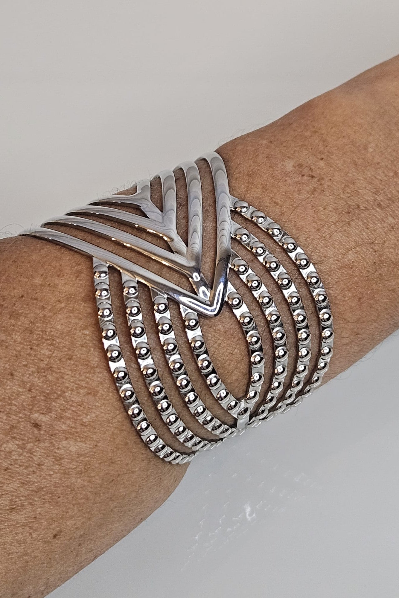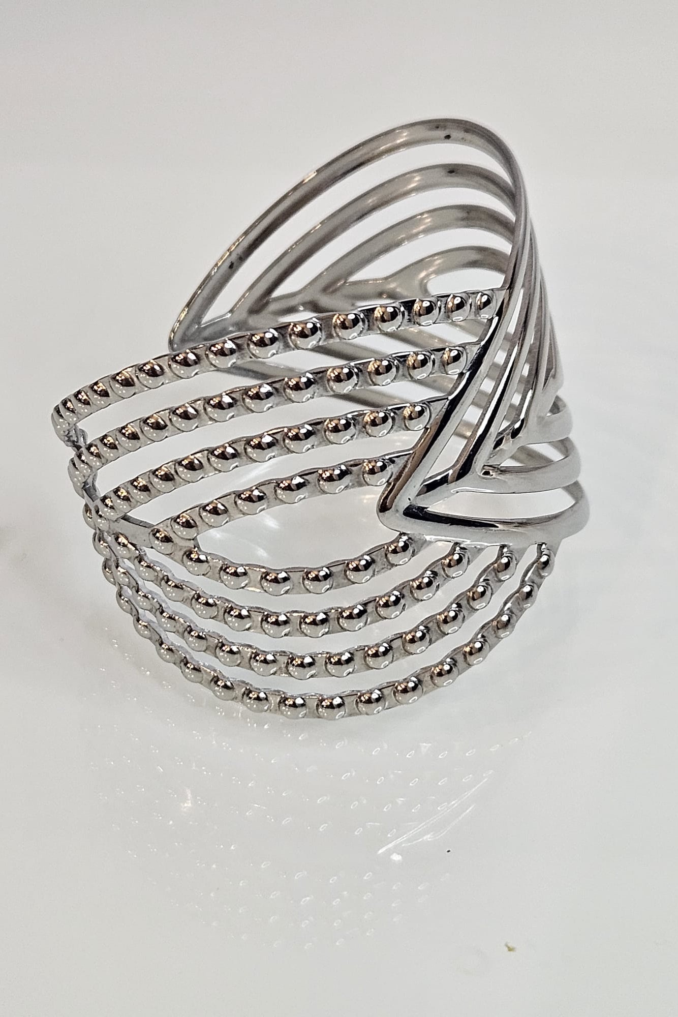SET DE BRAZALETE Y PANTALLAS DORADO Y/O PLATEADO, BRAZALETE CON UN ÁREA LISA Y OTRA CON ESFERAS, PANTALLAS OVALADAS ABIERTAS CON ESFERAS, STAINLESS STEEL