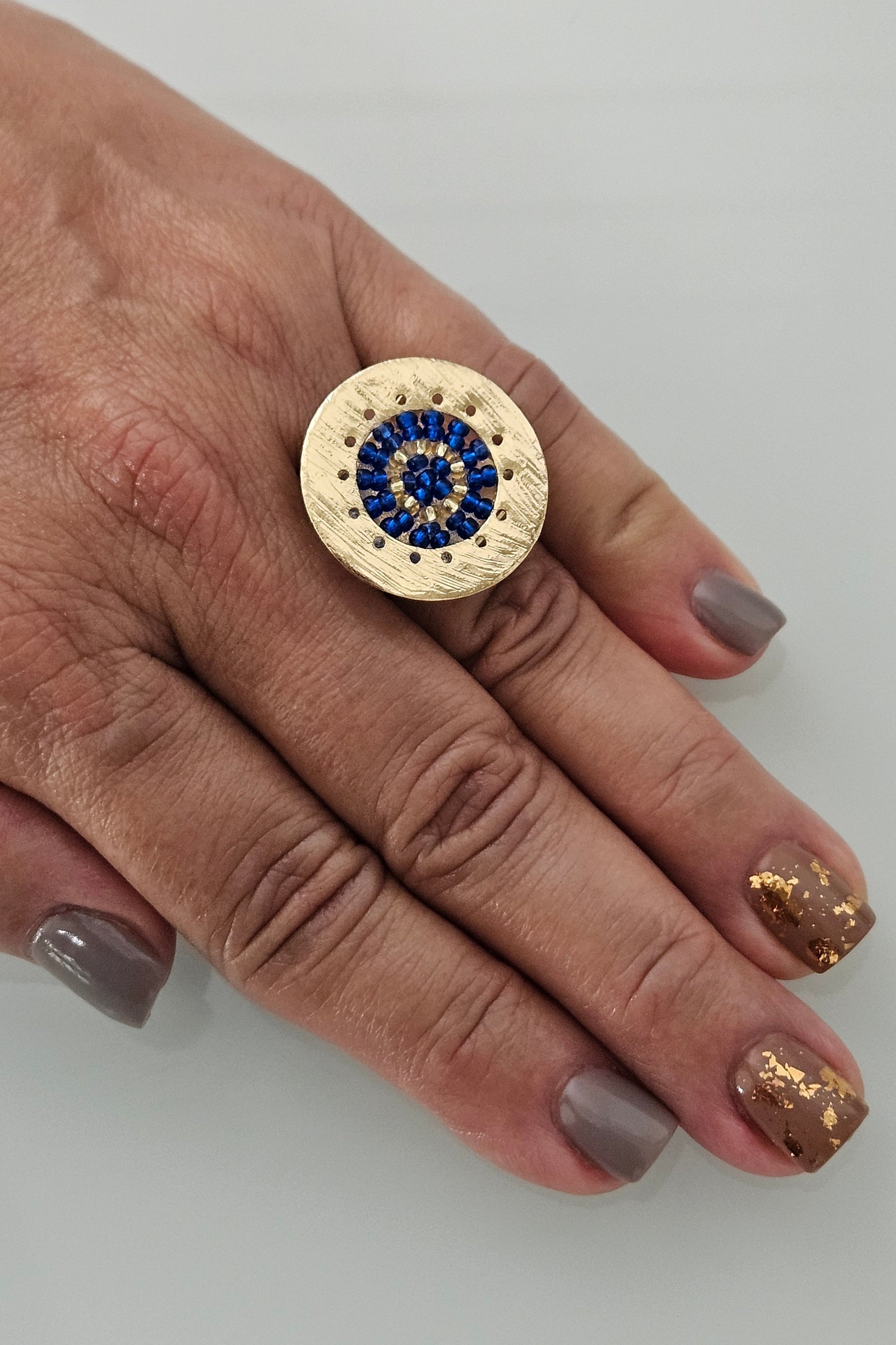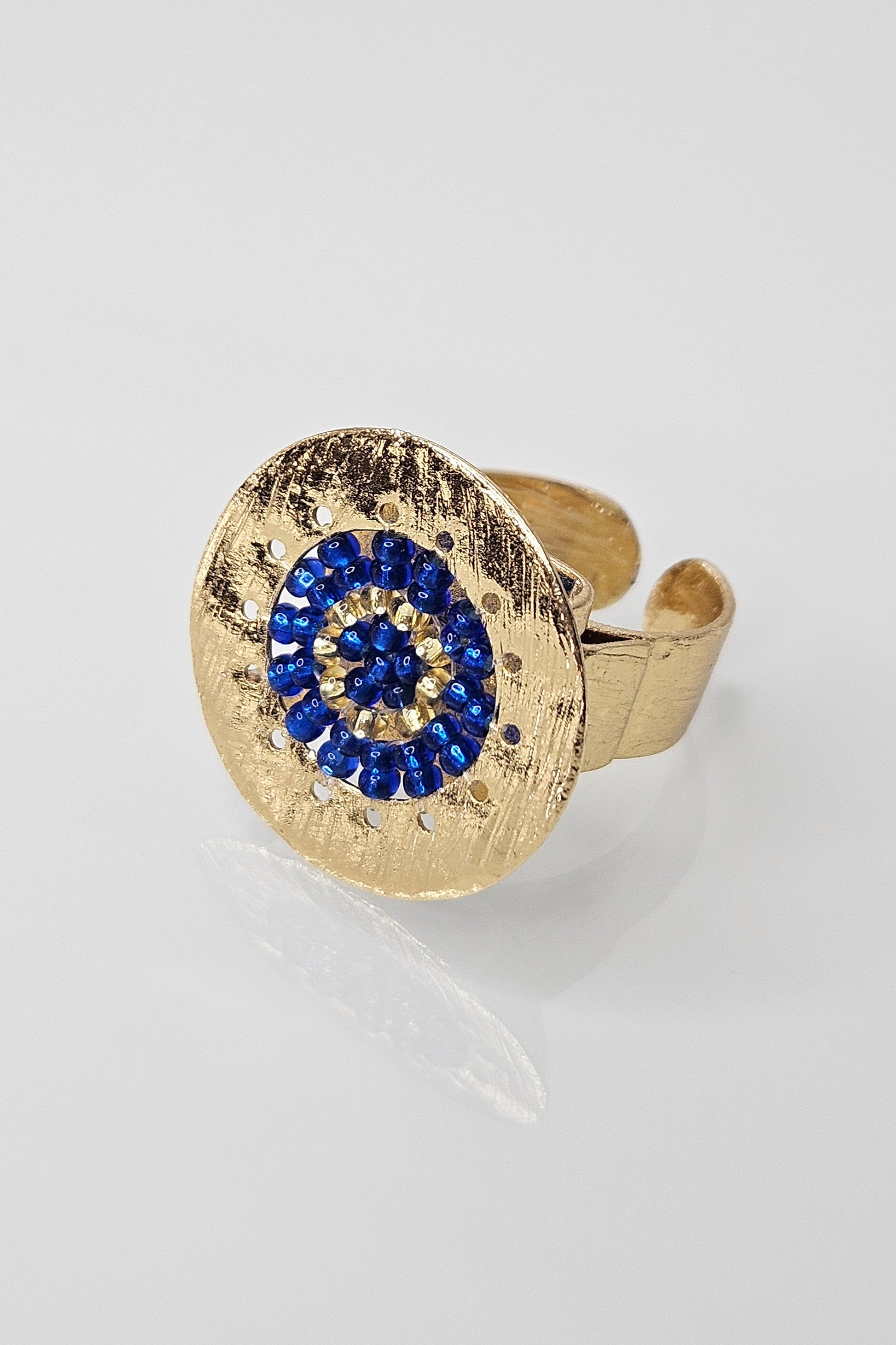 SORTIJA DORADA CON AZUL. ALUMINIO CON BAÑO DE ORO. ES AJUSTABLE Y BIEN LIVIANA. HECHO A MANO EN COLOMBIA.