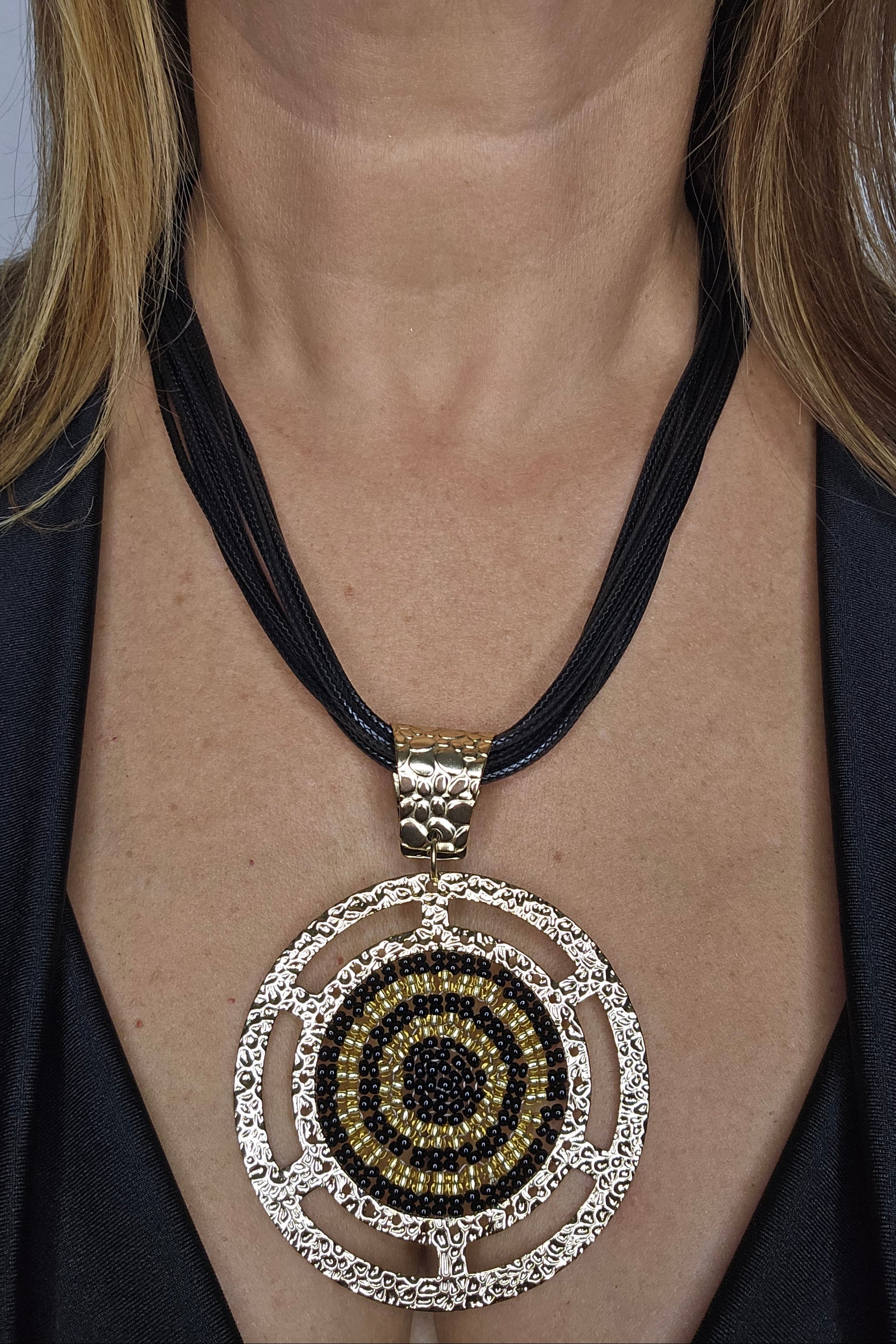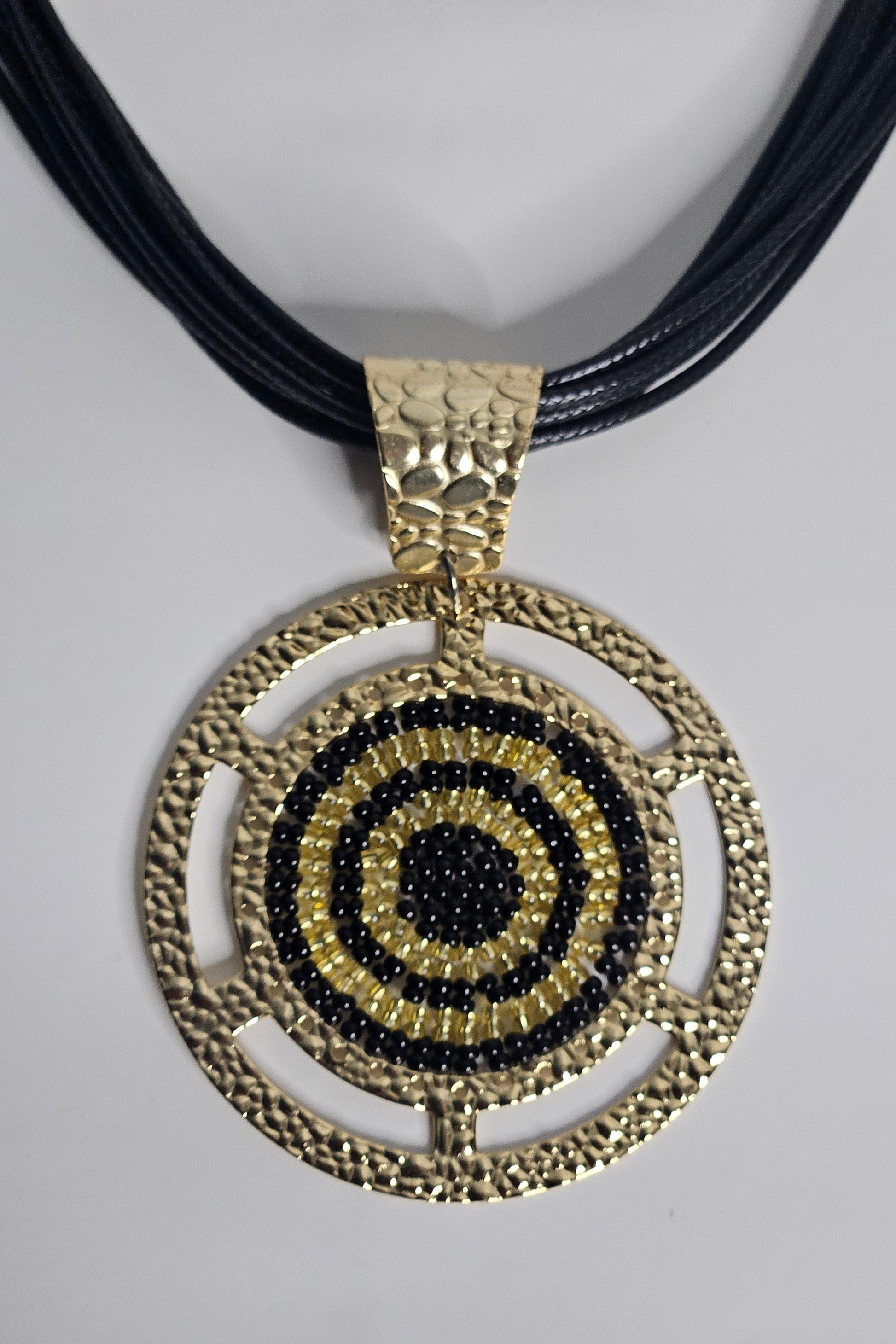 COLLAR NEGRO EN PIEL CON PENDANT REDONDO DORADO Y NEGRO
