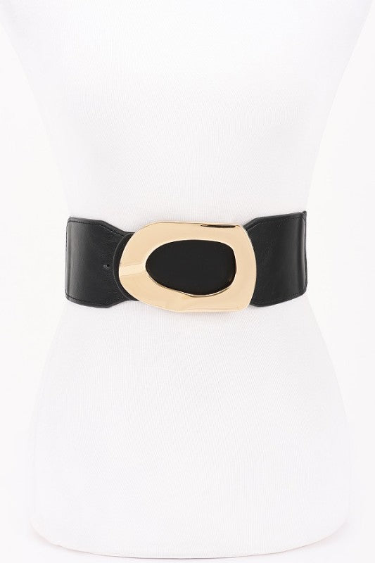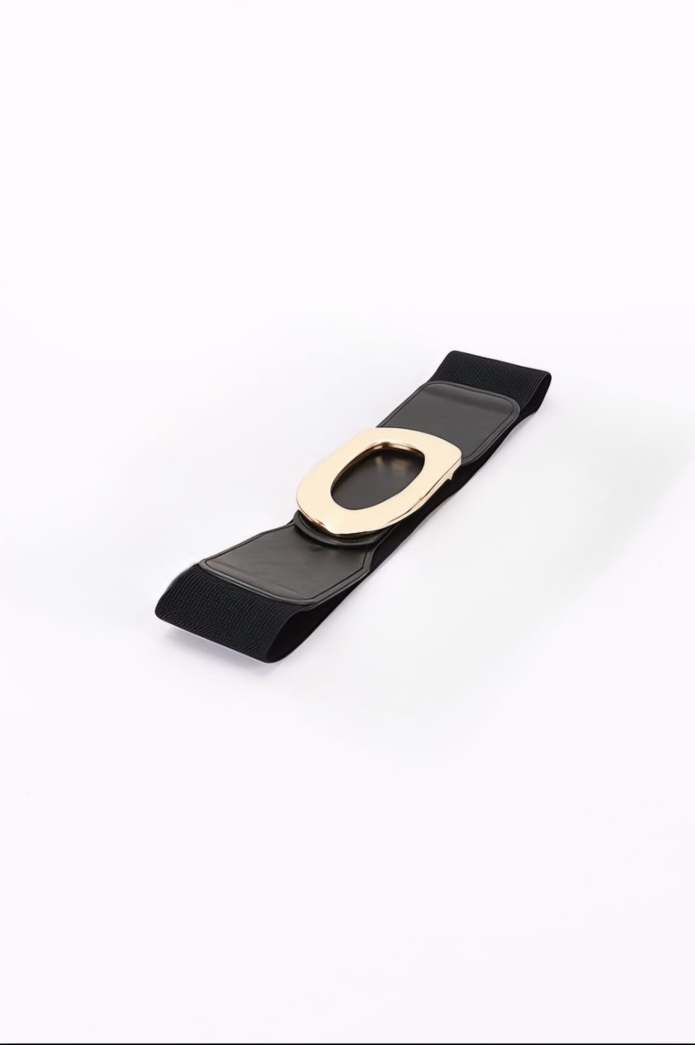 CINTURÓN ELÁSTICO NEGRO CON HEBILLA LLAMATIVA DORADA. ESTE CINTURÓN CUENTA CON UNA CORREA ANCHA DE CUERO Y UNA HEBILLA METÁLICA EXTRAGRANDE Y LLAMATIVA. EL DISEÑO ÚNICO DE LA HEBILLA LE DA UN ASPECTO AUDAZ Y MODERNO, CONVIRTIÉNDOLO EN UN ACCESORIO QUE DESTACA.
