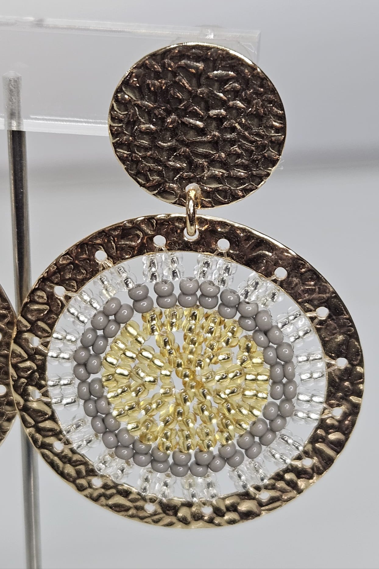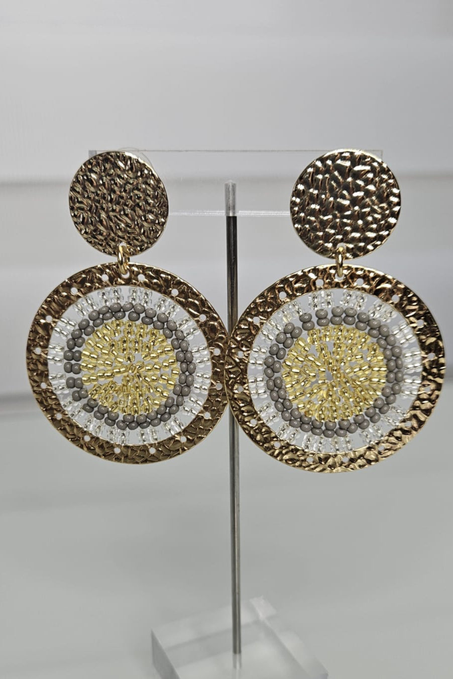 PANTALLAS REDONDAS DORADAS CON BLANCO Y GRIS. ALUMINIO CON BAÑO DE ORO. SON BIEN LIVIANAS. HECHO A MANO EN COLOMBIA.