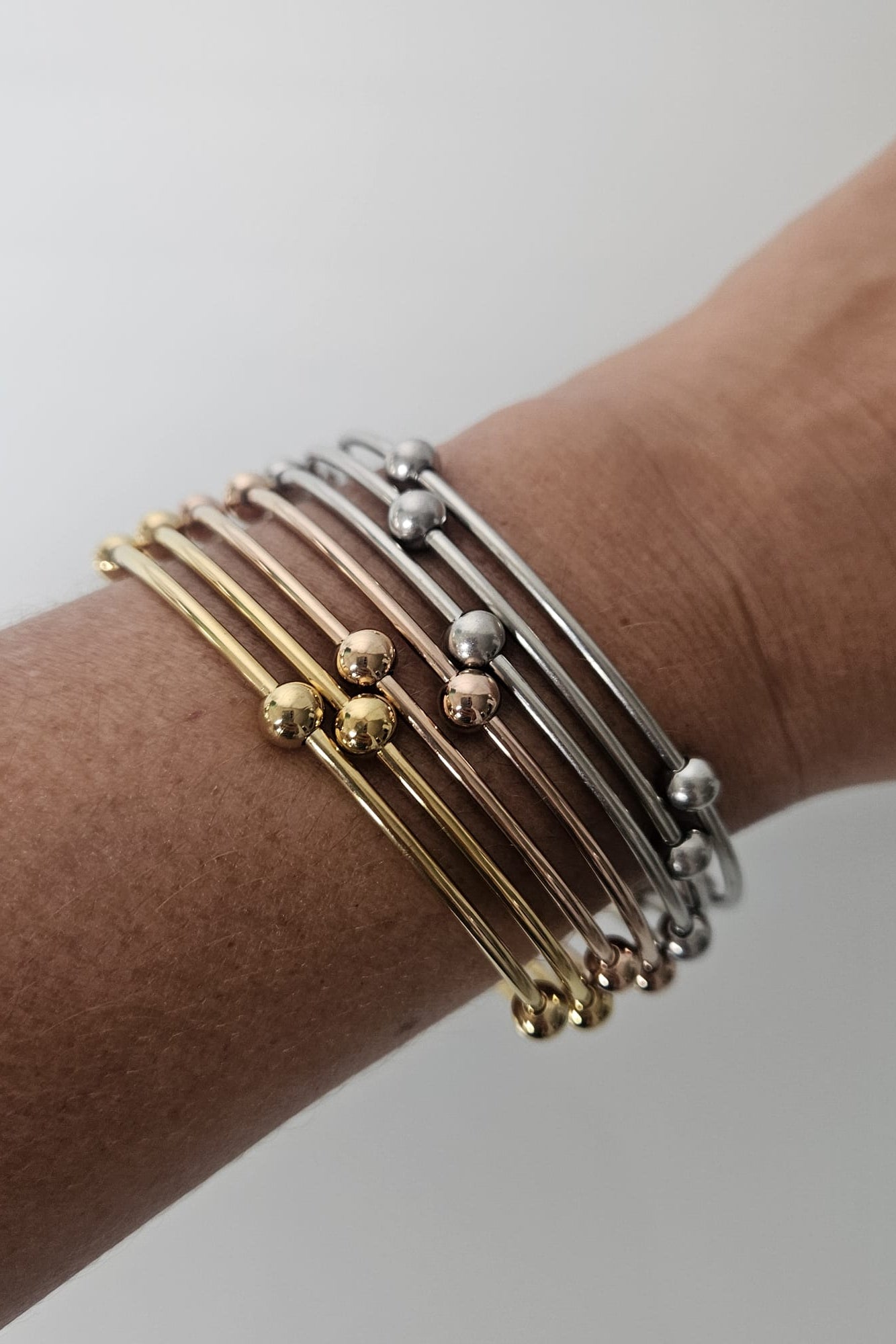 PULSERAS "BANGLES" TRICOLOR CON ESFERAS. INCLUYE 3 PULSERAS PLATEADAS, 2 DORADAS Y 2 "ROSE GOLD". STAINLESS STEEL.