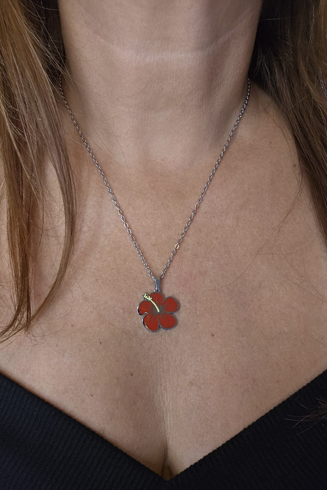 SET DE CADENA PLATEADA CON AMAPOLA ROJA, PANTALLAS Y SORTIJA. STAINLESS STEEL.