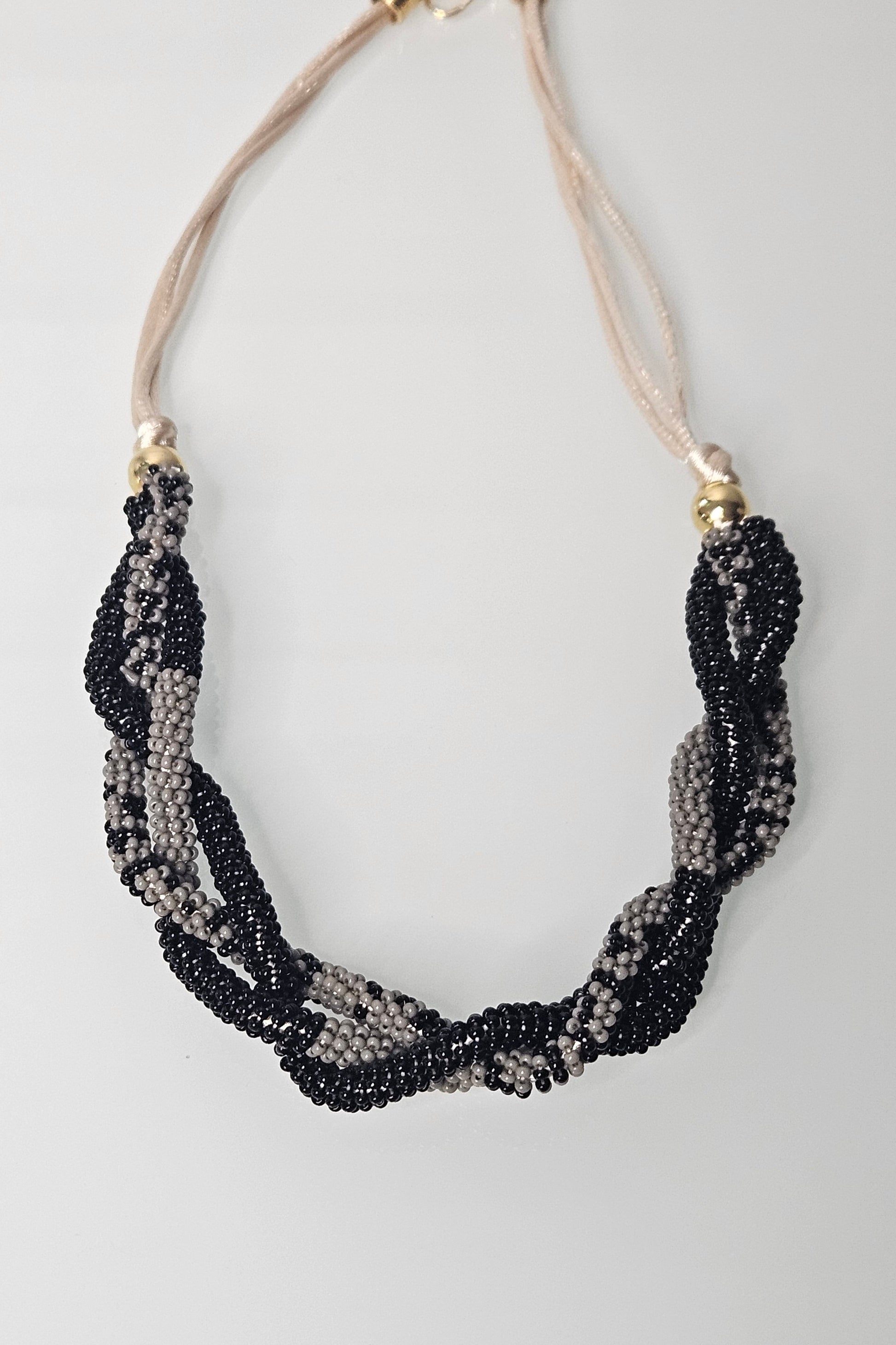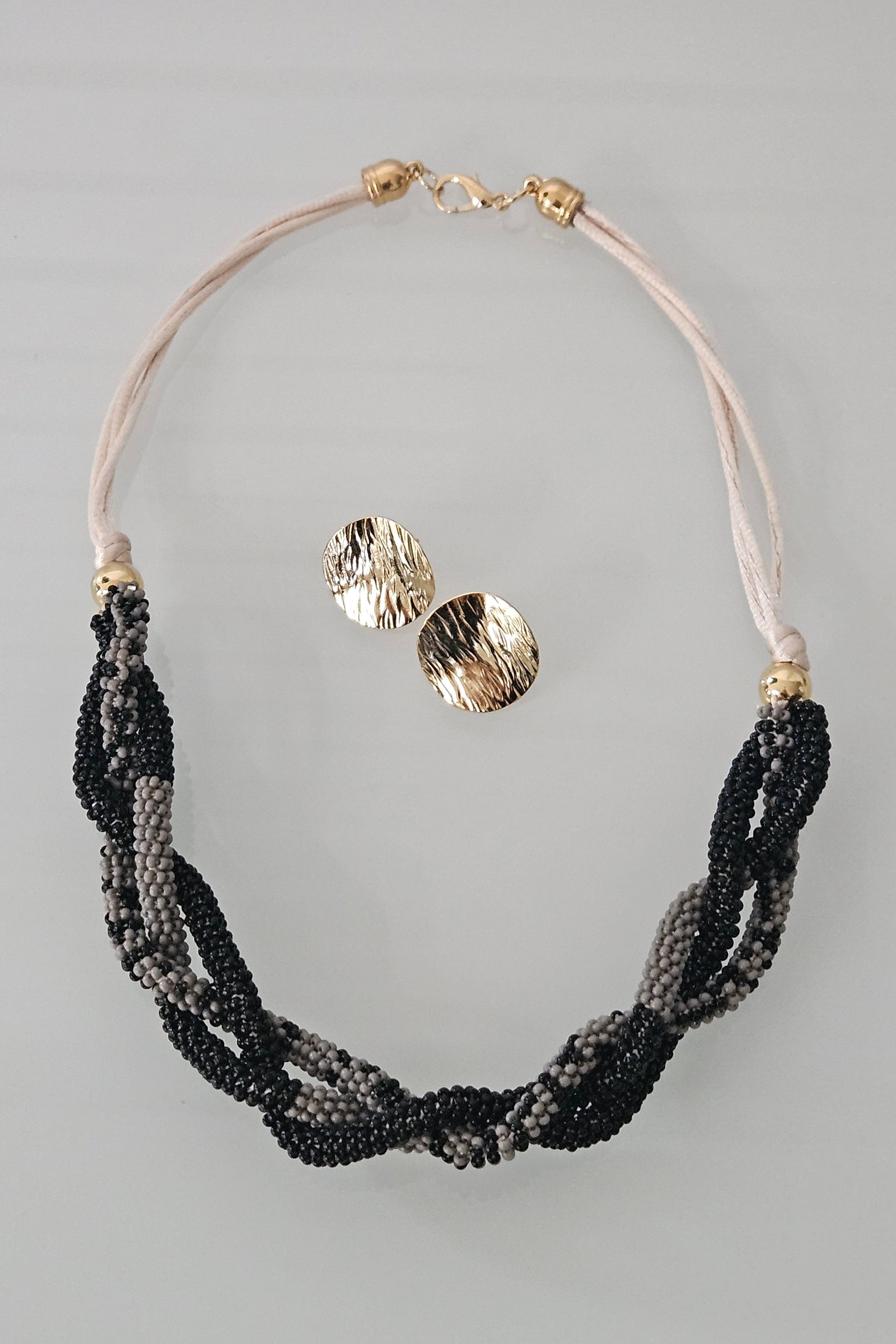 SET DE COLLAR TRENZADO NEGRO Y GRIS CON PANTALLAS DORADAS
