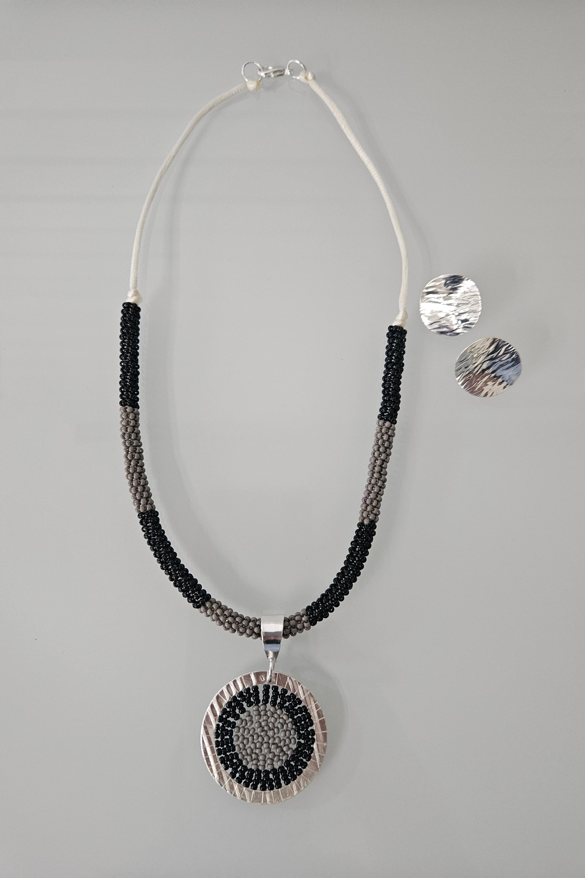 SET DE COLLAR NEGRO Y GRIS CON PENDANT REDONDO PLATEADO Y PANTALLAS. COLLAR EN BEADS Y CORDÓN, PENDANT EN ALUMINIO CON BAÑO DE PLATA. LA PIEZA ES BIEN LIVIANA. HECHO A MANO EN COLOMBIA.