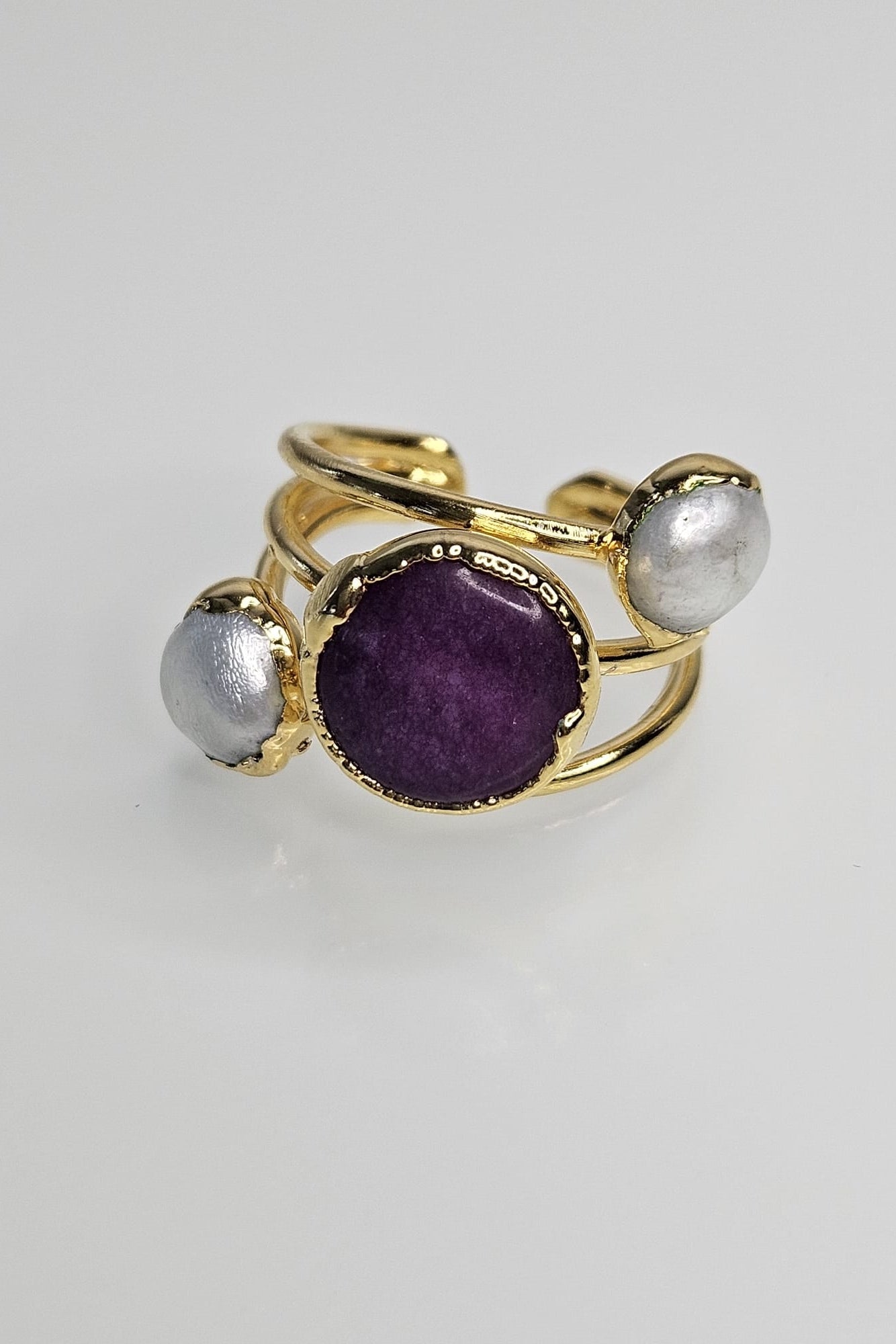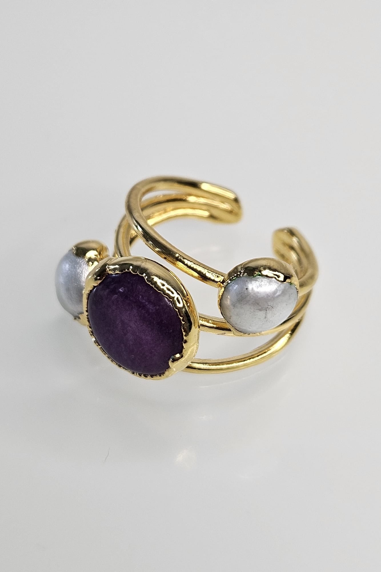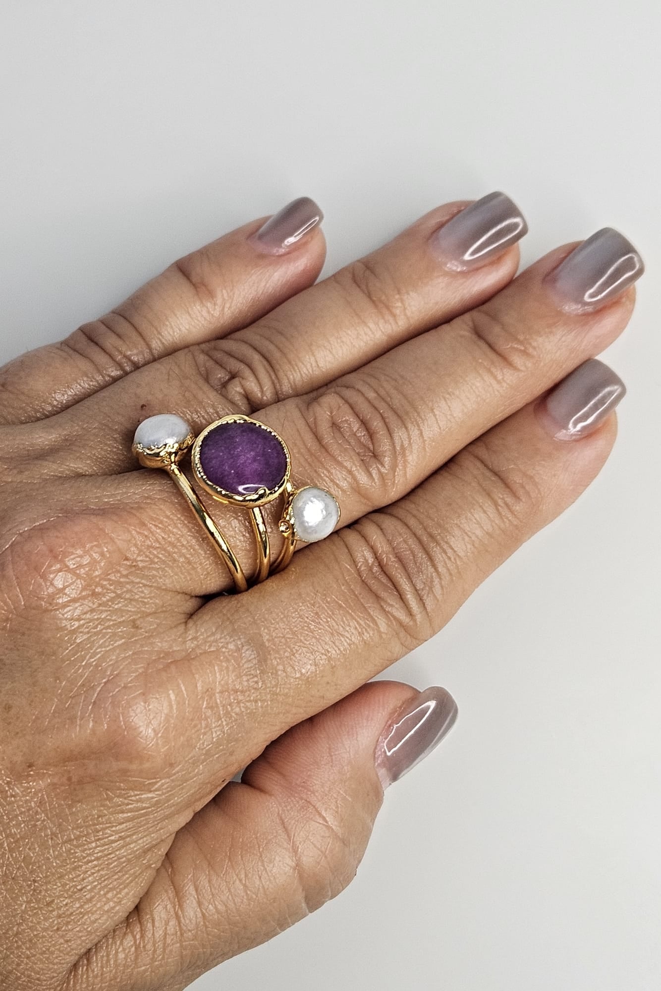 SORTIJA TURCA DORADA CON PIEDRA VIOLETA Y MADRE PERLA, TRES AROS, AJUSTABLE.