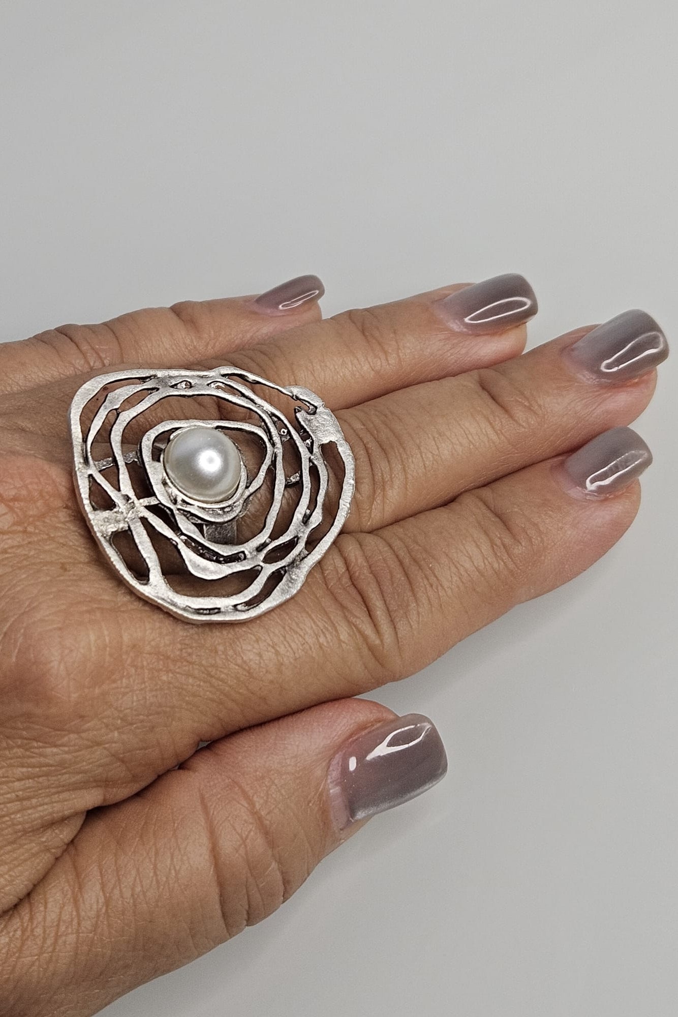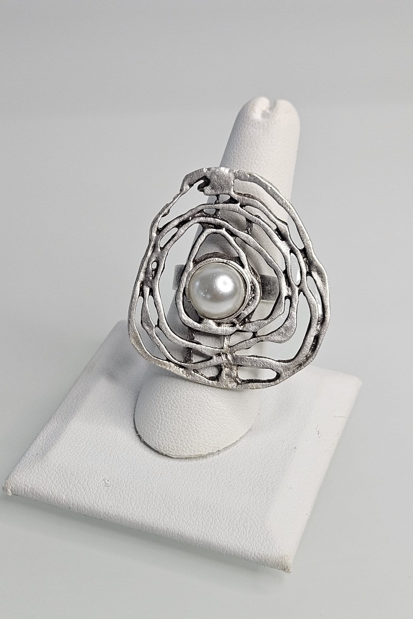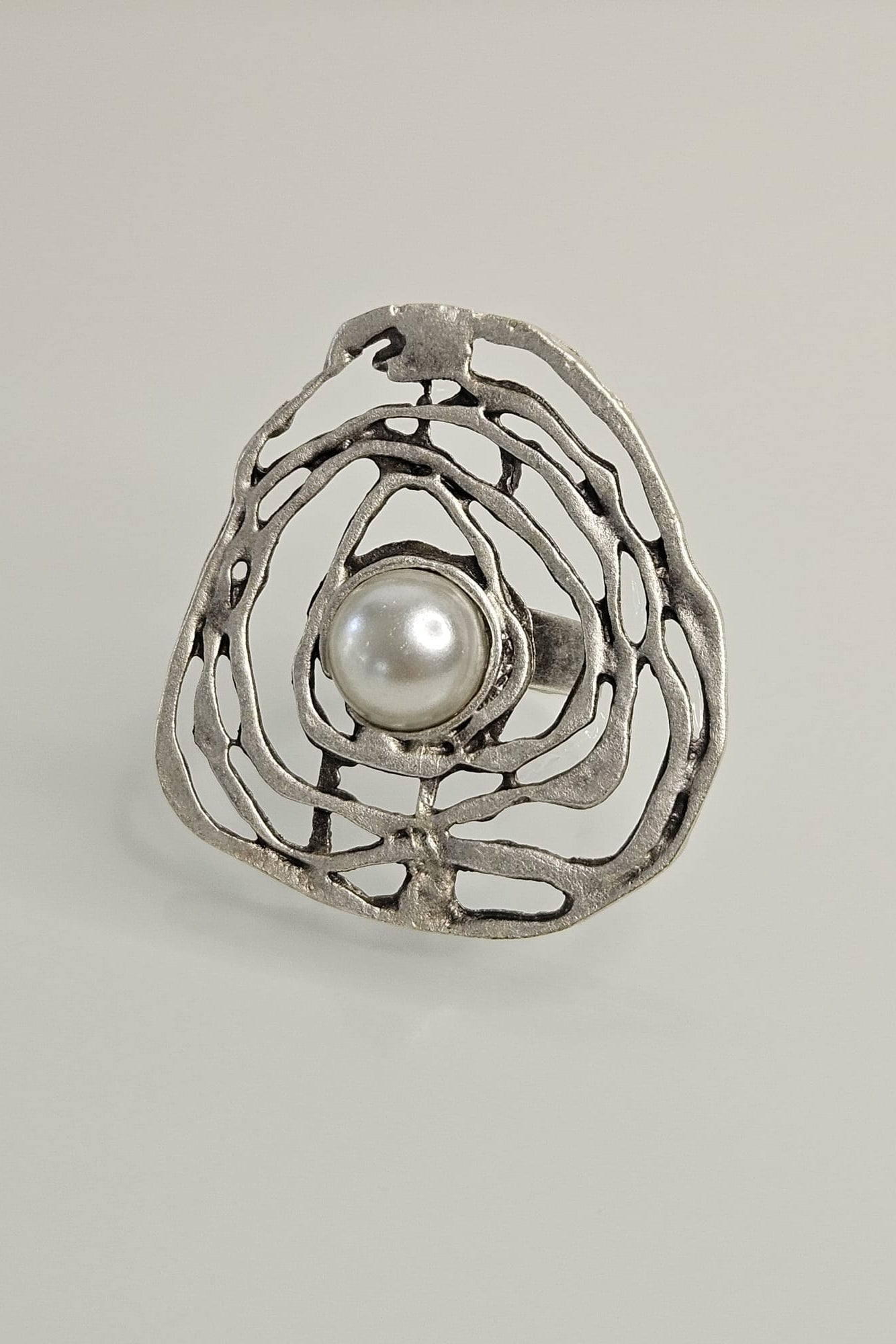 SORTIJA TURCA PLATEADO MATE DISEÑO ABSTRACTO CON PERLA