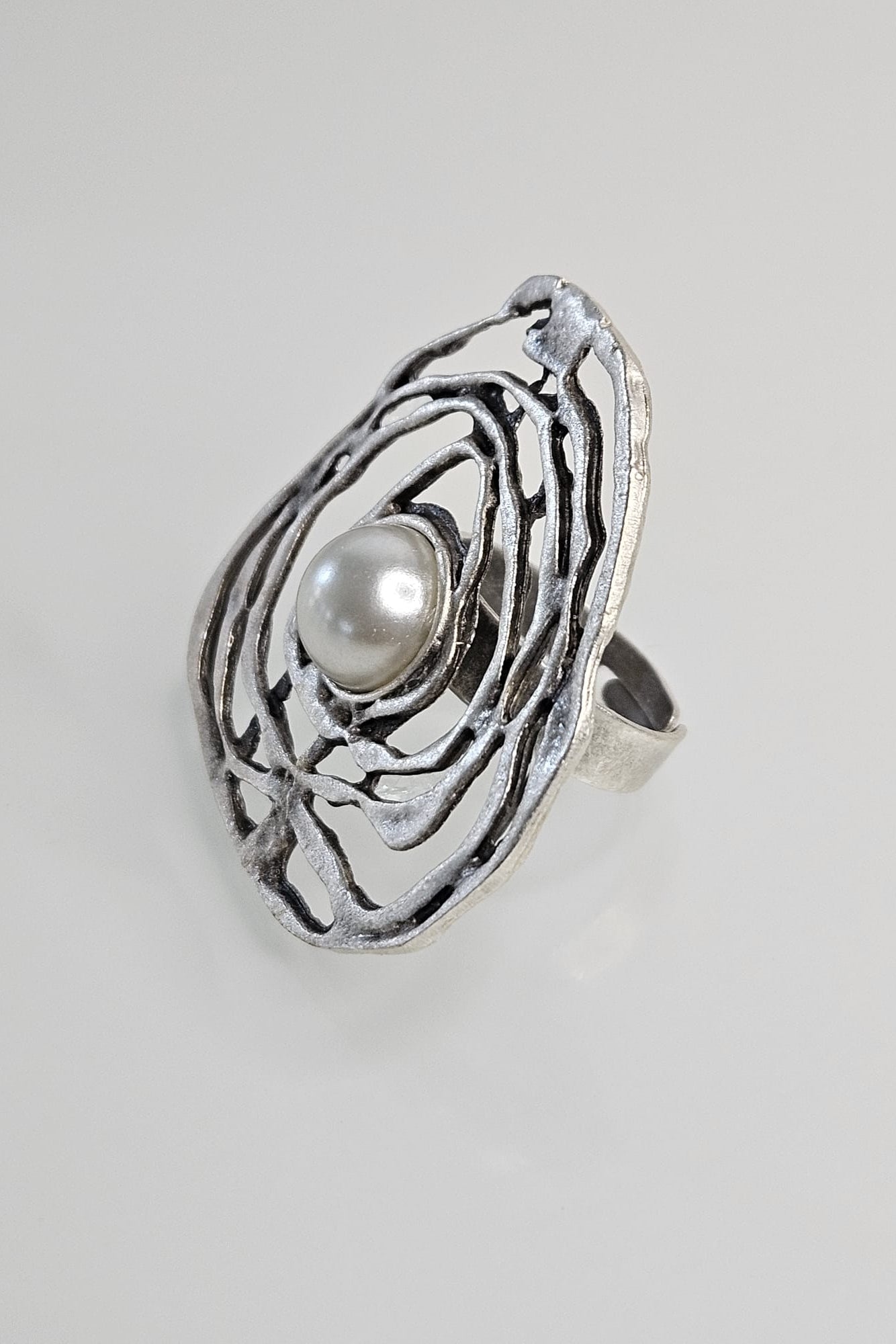 SORTIJA TURCA PLATEADO MATE DISEÑO ABSTRACTO CON PERLA EN EL CENTRO, AJUSTABLE